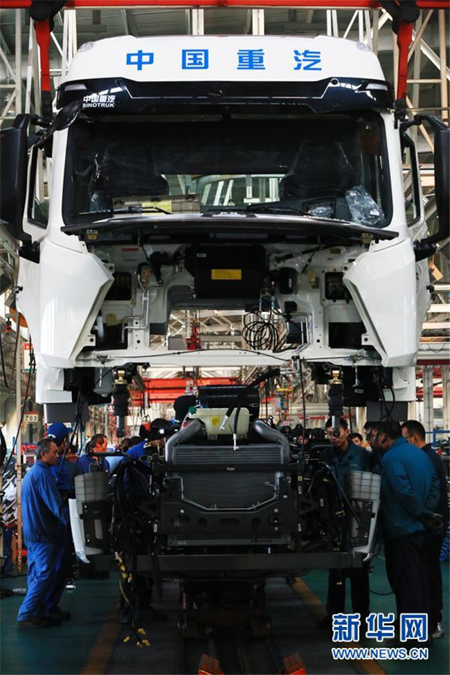 工人在中國重汽集團濟寧商用車總裝生產(chǎn)線上裝配汽車(11月22日攝)。 新華社發(fā)(李明放 攝)