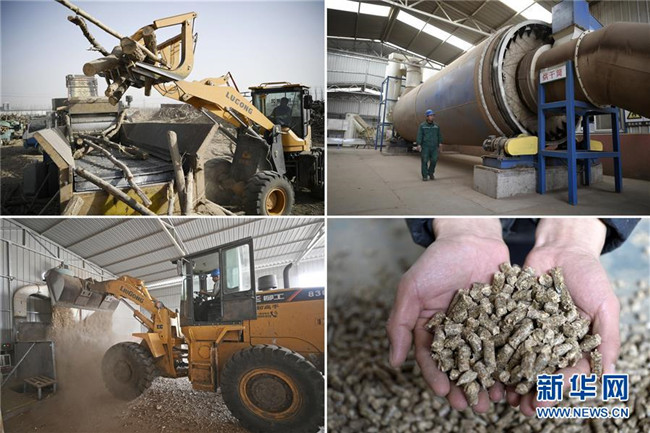 這是由11月27日拍攝的照片組成的拼版照片:左上圖為粉碎設(shè)備將秸稈、廢棄木材初步粉碎;右上圖為秸稈、廢棄木材經(jīng)過粉碎后進(jìn)行烘干處理;左下圖為工作人員用鏟車將初步粉碎的渣料填入機(jī)器進(jìn)行處理;右下圖為秸稈、廢棄木材制成的生物質(zhì)顆粒燃料。