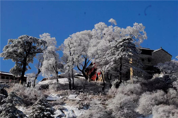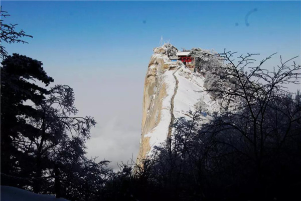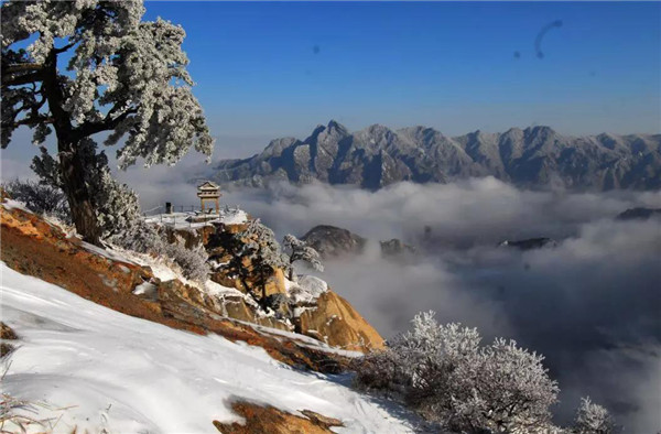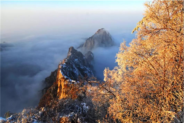 華山在11月下旬進入冬季,12月至次年3月是華山雪季。游客可欣賞到難得一見的華山雪景——美麗的霧凇給樹木、巖石、屋舍都披上一層晶瑩的薄衣,尤其在大雪覆蓋后,山景變成一幅曼妙的白色圖畫,峰上的樹木和古藤被透明的冰層包裹,極富魅力。