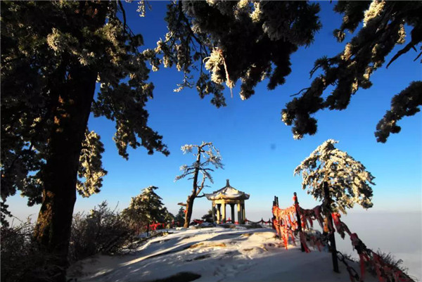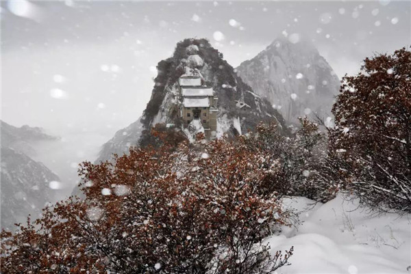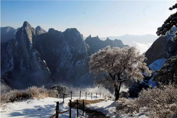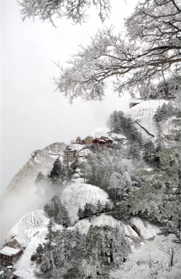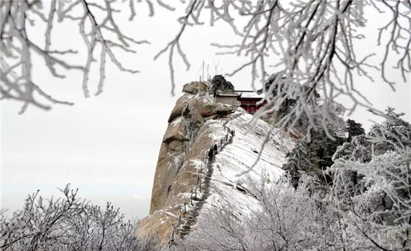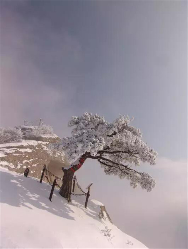 雪落華山,圣潔的雪花把華山妝扮得分外妖嬈嫵媚,平日陡峭的巖石,象穿著潔白的羽衣,宛若天仙般亭亭玉立于峰頭路旁,似向游人拂疑,微笑致意,最讓為之從心里震顏起敬的是,華山雪中松樹(shù)的雄姿與風(fēng)情。