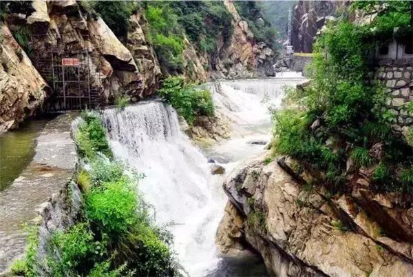 仙峪,又名車箱谷,在華山峪西,與華山峪僅一嶺之隔。傳說古時(shí)黃初平、黃初起弟兄在此牧羊成仙,因而得名。仙峪深五十余里,峪道窄狹清幽,山路崎嶇蜿蜒,河流湍急,山石險(xiǎn)峻,多處路段鑿崖,加棧凌空通過。進(jìn)峪五里處,有斜嶺橫阻,令人有谷盡路絕之感,然越嶺橫度,又平添柳暗花明的情趣。