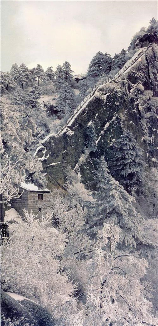 冬天的華山猶如一幅水墨山水畫,霧凇給山峰上的樹木、巖石、屋舍全部披上了一層晶瑩的薄衣,游客仿佛踏入一個(gè)夢幻世界。