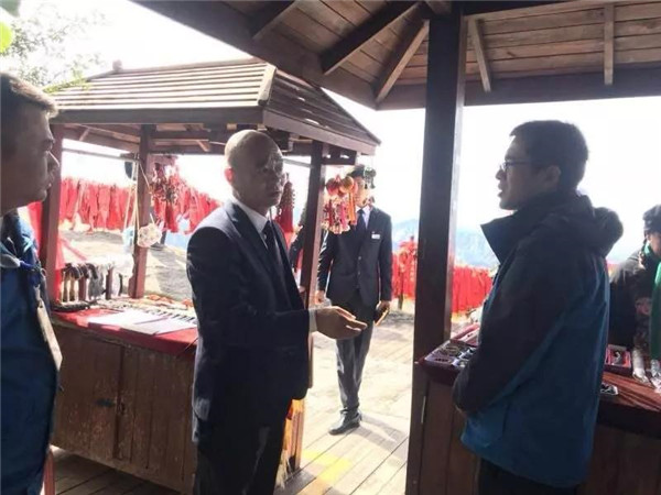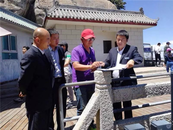 其實,雷科峰平時對大家要求挺嚴的,職工背后議論說雷科峰有一種軍人作風,凌厲、硬氣,大家跟上他干事活多還辛苦。印象最深的是那一次美化南天門“三間房一頁瓦”附近的臺地。坑洼不平的臺地上原來蒙著一堆土,晴天一層灰,雨天滿地泥,冬天雪泥一凍一消,平臺就成了沼澤,不說過來過去行走不便,看起來也讓人不舒服,游客常常一不小心就濺得滿身的泥水,很掃興,雷科峰下決心美化平臺。美化平臺所用的沙子、石子、水泥要到二三里路遠的溝底去背。從山頂?shù)綔系?,一路上全是立坡陡崖,雷科峰領(lǐng)著十幾名職工利用六天的工余時間,硬是把近二十噸的沙石背了上來。背料過程中,有的職工肩膀磨破了,有的雙腿像篩糠一樣抖個不停,許多職工中途不敢蹴下來休息,怕一蹴下就再也站不起來了,歇息時把沙袋子擱在路邊的石坎上,人站著緩口氣……一個個汗流浹背,氣喘吁吁。
