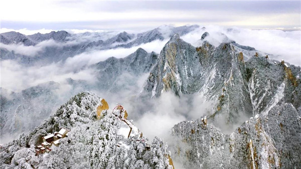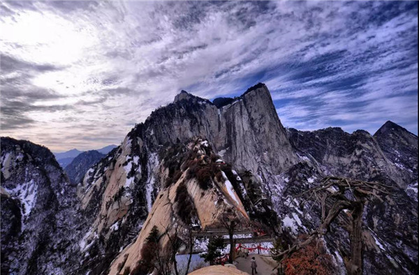 華山由五峰組成,其中東西南三峰呈鼎興相依,是為主峰,中峰和北峰相輔,而且還有七十多座小峰環(huán)衛(wèi)而立,宛如層層花瓣。五峰鼎峙聳立,高插云霄,形如刀削,登臨絕頂,頓覺(jué)“只有天在上,更無(wú)山與齊”之感。