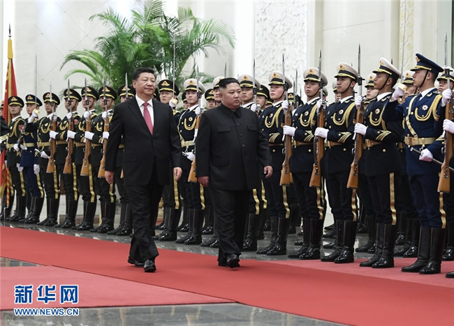 1月8日,中共中央總書記、國(guó)家主席習(xí)近平同當(dāng)日抵京的朝鮮勞動(dòng)黨委員長(zhǎng)、國(guó)務(wù)委員會(huì)委員長(zhǎng)金正恩舉行會(huì)談。會(huì)談前,習(xí)近平在人民大會(huì)堂北大廳為金正恩舉行歡迎儀式。 新華社記者 李學(xué)仁 攝