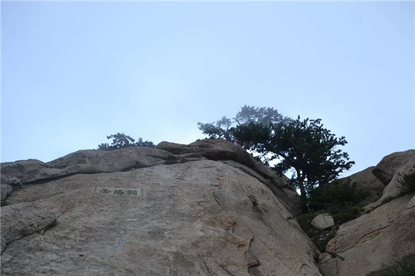 我和孩子抓緊時(shí)間往東峰趕,經(jīng)紫氣臺(tái)、二仙坎,攀爬一道石梁前往東峰山門。此時(shí)飄來(lái)小雨點(diǎn),我們顧不得腳下濕滑加快了腳步。經(jīng)鷂子翻身,孩子想要征服天險(xiǎn)的念頭依然強(qiáng)烈,一心想翻鷂子翻身,后因人多需排隊(duì)等候而暫時(shí)放棄。東峰又叫朝陽(yáng)峰,朝陽(yáng)臺(tái)是觀日出的勝地。我倆左轉(zhuǎn)攀爬朝陽(yáng)臺(tái),雨漸漸大起來(lái)。至臺(tái)頂,方舉目四顧,黃豆大小的密集雨點(diǎn)劈頭蓋臉砸下。朝陽(yáng)臺(tái)上沒有看到太陽(yáng),卻遭遇暴雨,我們狼狽撤離朝陽(yáng)臺(tái)。