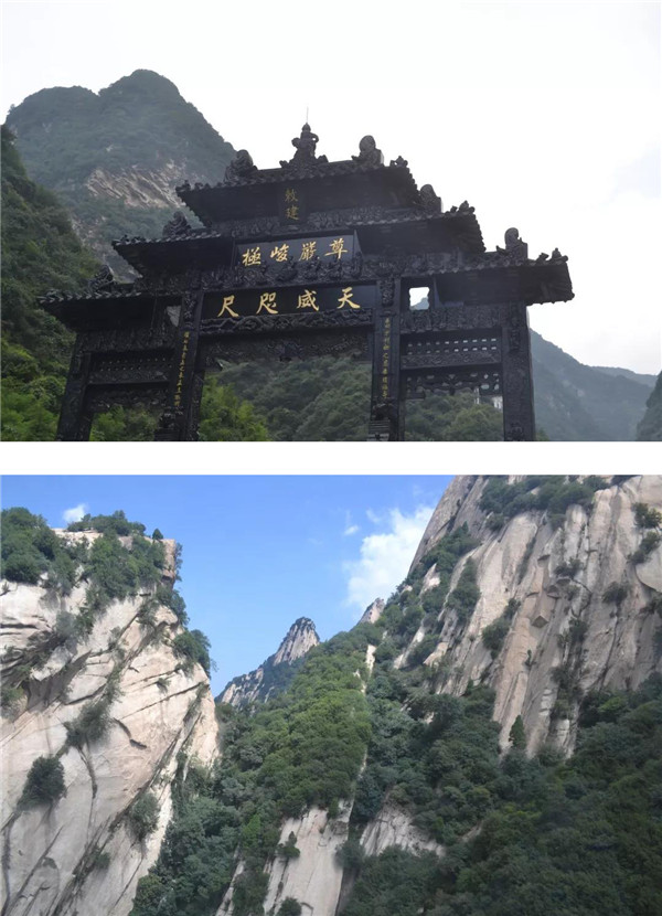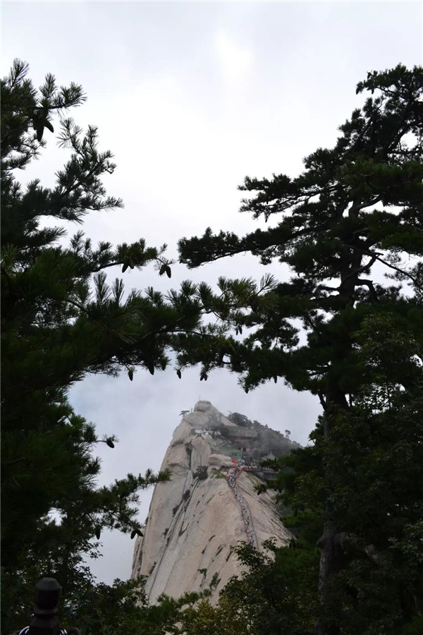 面向西峰方向,左側(cè)是斧劈般的絕壁,右側(cè)是坡度陡峭的山嶺。山脊兩側(cè)豎有結(jié)實(shí)的鐵柱,以腕粗的鐵鏈相連續(xù)。膽小的人屏住呼吸,緊抓鐵鏈前行;膽大的年輕人,不抓鐵鏈,走在中間,總讓人擔(dān)心他會(huì)滑跌!腳下的山脊有一定坡度,并不能踩平實(shí),就像走在傾斜的平衡木上。緊窄處,上山下山的人需錯(cuò)身通行。華山之險(xiǎn),讓我們刻骨銘心!