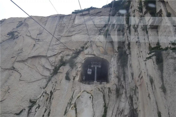 現(xiàn)在爬華山可不是“自古華山一條道”了,我們選擇坐西峰索道纜車,凌空飛渡千山萬(wàn)壑。說(shuō)是千山萬(wàn)壑,其實(shí)華山是由一塊完整碩大的花崗巖石體構(gòu)成的。《山海經(jīng)》記載:“太華之山,削成而四方,其高五千仞,其廣十里。”真的很難想像,這么連綿起伏、巨大的山體,其實(shí)是一個(gè)群峰競(jìng)秀的整體。華山,就是這么神奇!