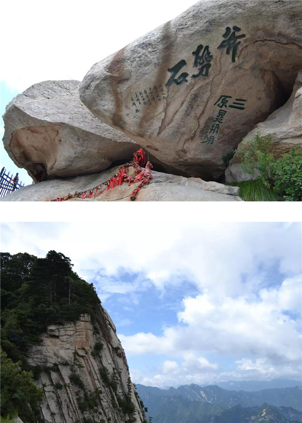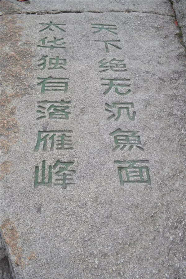 在南峰頂,孩子看到“天下絕無(wú)沉魚面,太華獨(dú)有落雁峰”的題刻,打趣我:“媽媽,你叫鴻雁,這里又叫落雁峰,真是和你有緣呢!快來(lái)這塊大石頭上落落腳,歇一歇!”“好?。≡蹅z都爬累了,都歇一歇!”我為孩子的體貼欣慰!