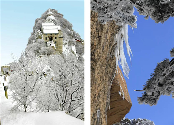 華山在11月進(jìn)入冬季,12月至次年3月全山飄雪,而2月前為最旺雪期。游客可欣賞到難得一見的華山雪景——美麗的霧凇給樹木、巖石、屋舍都披上一層晶瑩的薄衣,尤其在大雪覆蓋后,山景變成一幅曼妙的白色圖畫,峰上的樹木和古藤被透明的冰層包裹,極富魅力。