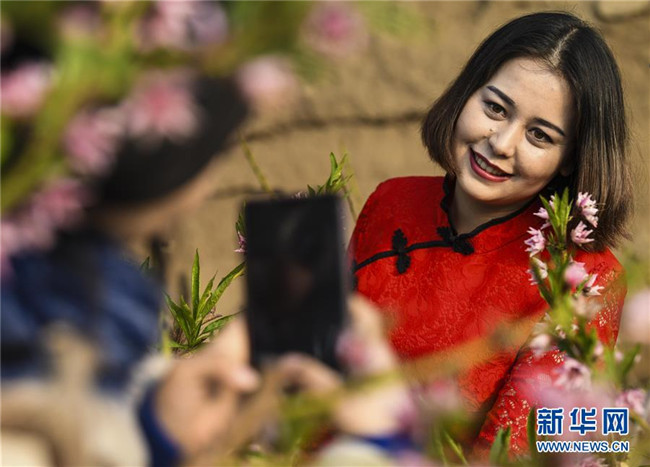 1月27日,在新疆鄯善縣辟展鎮(zhèn)大東湖溫室大棚基地內(nèi),游客在桃花前拍照。新華社記者王菲攝