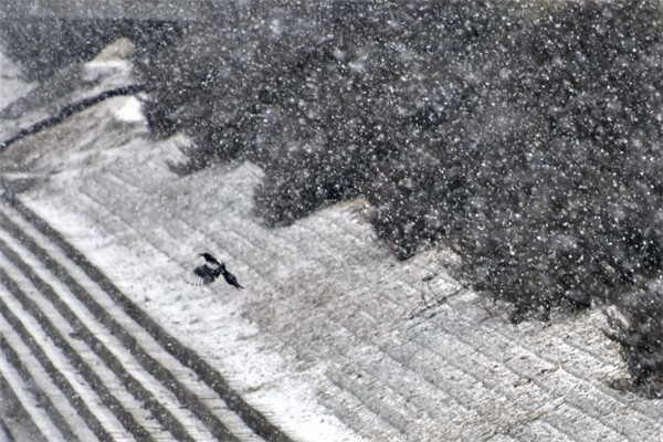 2月12日,一只喜鵲在北京的雪中飛舞。新華社記者 李欣 攝