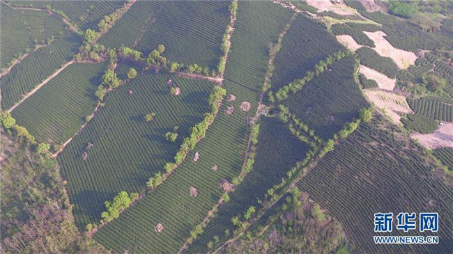 這是2018年4月2日拍攝的無(wú)錫宜興白塔村茶園(無(wú)人機(jī)拍攝)。 新華社記者 季春鵬 攝