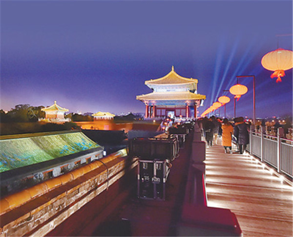 觀眾入場前,可觀賞午門城樓及東、西雁翅樓在燈光映照下的壯美雄姿。自午門入場后,首先觀賞點亮后的太和門廣場,隨后由午門西馬道登午門城樓,參觀“紫禁城里過大年”展覽,在東雁翅樓欣賞中央民族樂團琵琶演奏家趙聰及其團隊的演奏。結(jié)束午門展廳參觀后,觀眾沿著由紅燈籠點綴的城墻步行至東南角樓,觀看虛擬現(xiàn)實影片《角樓》,隨后來到東華門城樓,參觀“營造之道——紫禁城建筑藝術(shù)展”。當(dāng)走過近千米長的布滿紅燈籠的故宮東城墻時,可以看到臨近城墻西側(cè)的部分古建筑也被點亮,聆聽暢音閣戲樓傳來的戲曲聲。到達(dá)東北角樓后,觀眾步行至神武門,在這一區(qū)域可以觀賞到城墻南北兩側(cè)通過藝術(shù)燈光投影于建筑屋頂上的《千里江山圖》等作品,從而產(chǎn)生人在畫中游的感覺。離開神武門城樓后,神武門外東、西兩側(cè)的角樓餐廳和角樓咖啡靜候光臨,從而結(jié)束此次“上元之夜”文化活動。