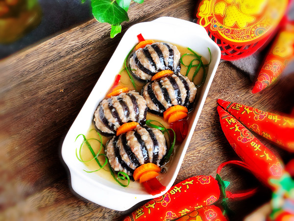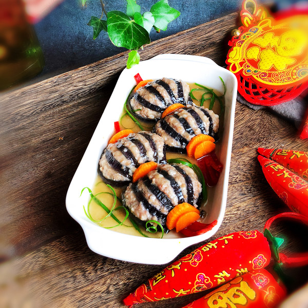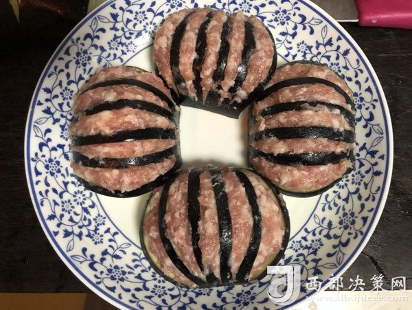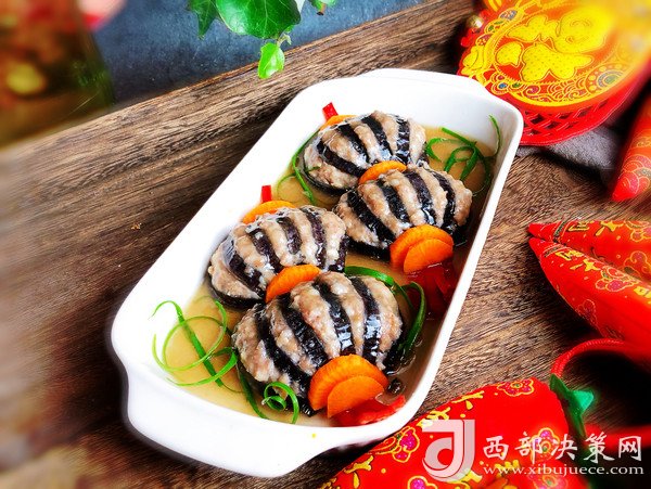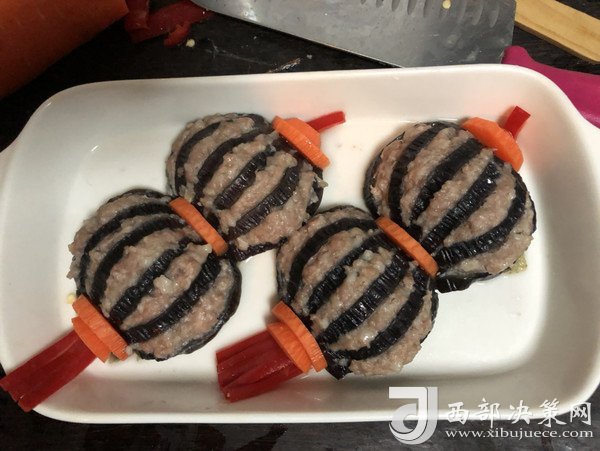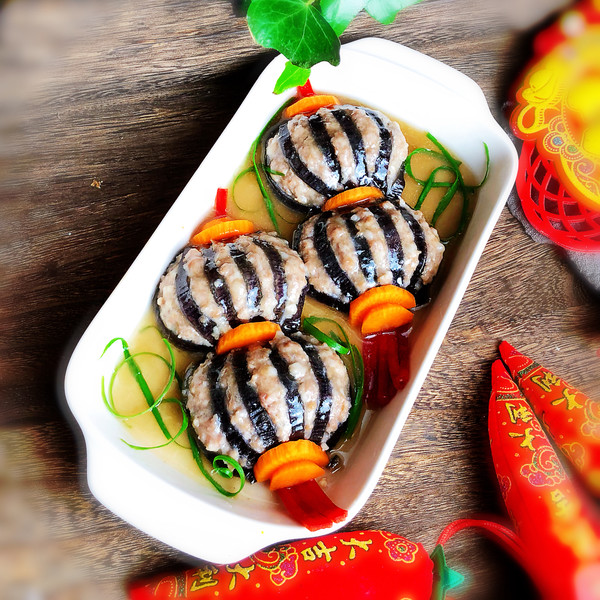 “今天買了一個大茄子,釀入豬肉餡,樣子像極了燈籠,如果你想顏色更深一點,那就在調肉餡的時候加點老抽甚至加點紅曲粉,最后調澆汁的時候可以調成酸甜的番茄汁味,那就看起來更加的紅紅火火了。不過我還是比較喜歡這種小清新的風格。這道菜一上桌,能把大魚大肉都比下去,好看好吃還喜慶。”