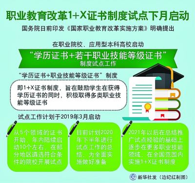 “職教20條”提出,從2019年開始,在職業(yè)院校、應用型本科高校啟動“學歷證書+若干職業(yè)技能等級證書”制度試點(以下稱1+X證書制度試點)工作。試點工作要進一步發(fā)揮好學歷證書作用,夯實學生可持續(xù)發(fā)展基礎(chǔ),鼓勵職業(yè)院校學生在獲得學歷證書的同時,積極取得多類職業(yè)技能等級證書,提高就業(yè)創(chuàng)業(yè)本領(lǐng),緩解結(jié)構(gòu)性就業(yè)矛盾。