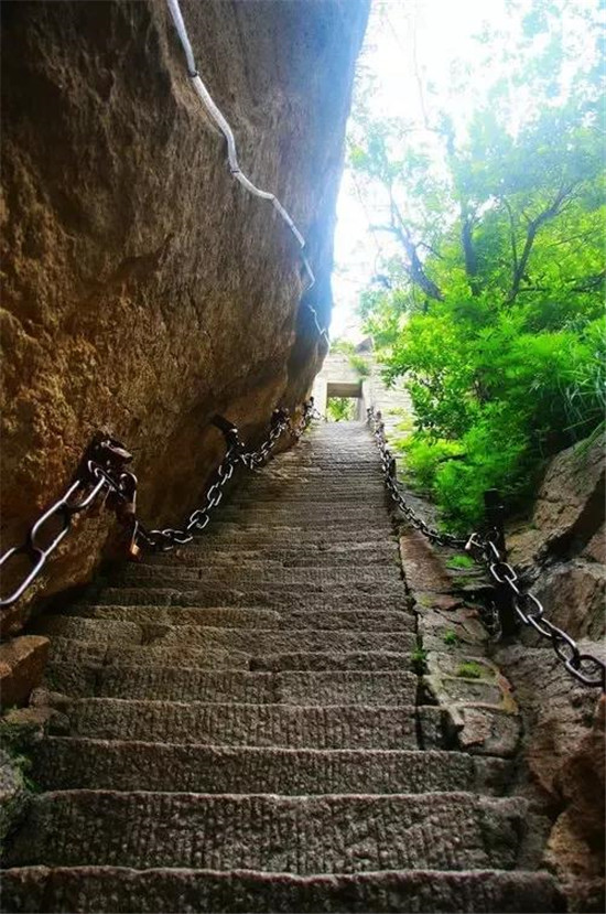 這里,山幢壁直立,其間僅容二人上下穿行。兩邊鐵鏈垂直下垂,狀如刀刻鋸截。坡度為70°。從上到下共有370多個臺階,皆不滿足寬。登時上視,一線天開,形如青蛙在跳,又如粘壁之鼯。下比上時更險,如臨深井,心驚目眩。故而常有人下來時倒退而行,從胯下窺視路面。“千尺幢”頂端,有僅容一人的石洞,因?yàn)楫?dāng)人們爬上最后一個石級時,便從洞中鉆出,故而此洞名叫“天井”。“天井”上有一平臺,臺上刻寫的“太華咽喉”,形象的說明了這里的路形。