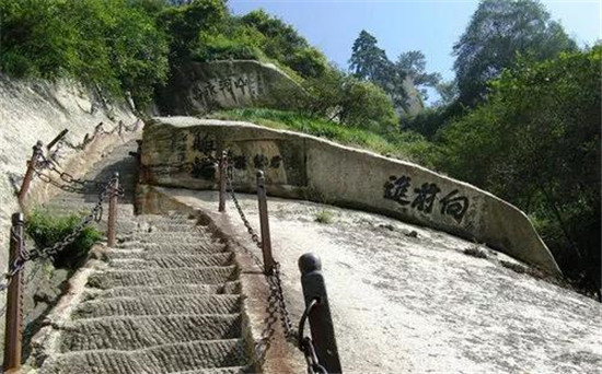 因嶺脊青黑,蜿蜓盤旋,就像蒼龍騰空,因而得名。嶺脊上、下高差約500米。在唐代以前,此路初通,僅鑿石窩,兩邊并未加欄,登嶺多是爬行,如騎龍背。到了明代,這里雖比唐代好些,但仍然很危險。解放后,1964年,將原嶺魚脊形鑿平加欄,1985年,又繼續(xù)下鑿,才將嶺道拓寬?,F(xiàn)在游人至此便不覺有多危險了。
