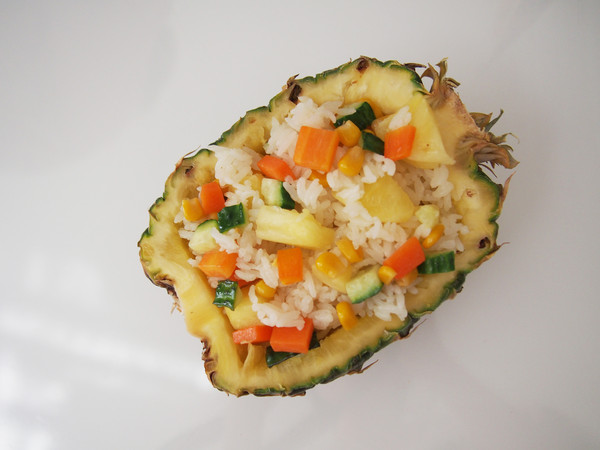 5.等待蒸米飯的時(shí)候,準(zhǔn)備其他食材。將菠蘿果肉挖出來(lái),切成丁