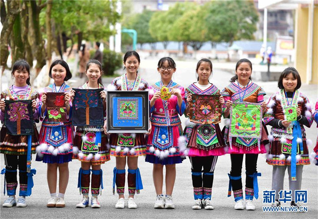 在融水苗族自治縣民族中學,女童班的學生在展示刺繡作品(3月22日攝)。  新華社記者 黃孝邦 攝