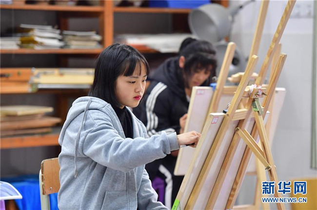 在融水苗族自治縣桿洞中學,學生在繪畫室里上課(3月13日攝)。  新華社記者 黃孝邦 攝