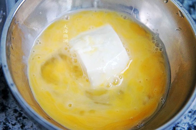 3.雞蛋打散,攪拌均勻,豆腐四面沾些面粉,裹上蛋液