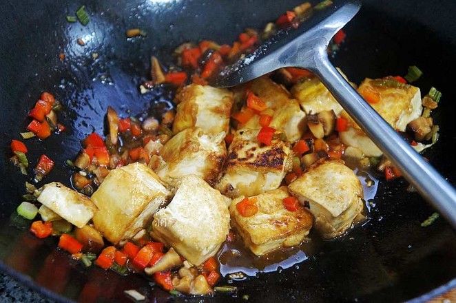 主料:豆腐10小塊 紅椒半個(gè) 青椒半個(gè) 香菇2朵