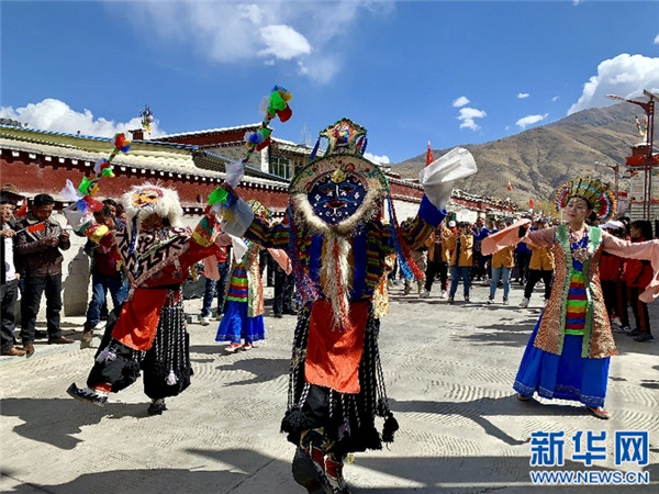 國家級藏戲傳承人班典旺久(中)。新華網(wǎng) 達(dá)珍 攝