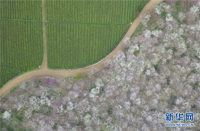 這是3月27日拍攝的貴州省貴安新區(qū)櫻花觀光園的櫻花和旁邊的茶園(無(wú)人機(jī)拍攝)。新華社記者 陳曄華 攝