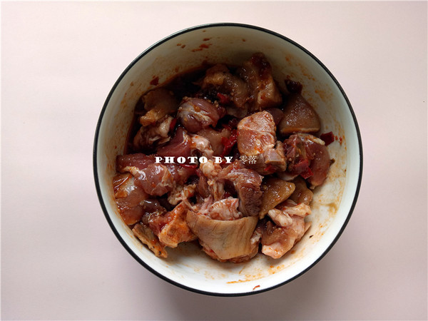 2.豬肉里調入料酒、醬油、鹽、糖、鮮椒醬、蠔油;