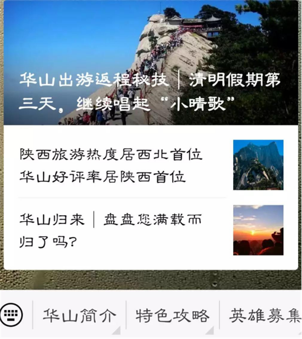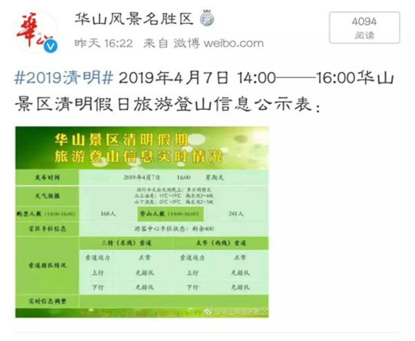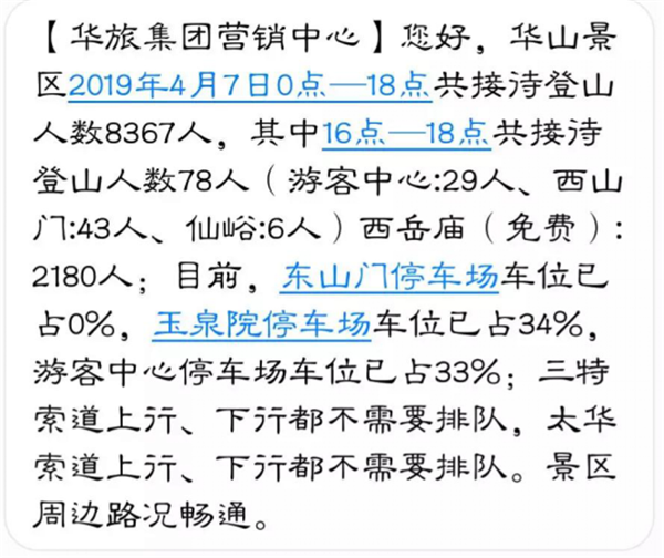 景區(qū)節(jié)日期間通過電子大屏、官方微博、微信、短信平臺向游客和各單位提供實時登山排隊人數(shù)、車位、天氣等信息。(小長假期間新浪微博共計發(fā)送微博48條,網(wǎng)友留言及回復361條,閱讀量共計421446余次;微信公眾平臺共計發(fā)送18篇軟文報道,分享及轉(zhuǎn)發(fā)量共計1098次,閱讀量共計10272次;短信平臺共計發(fā)送2394條短信,及時匯報各項旅游信息)。