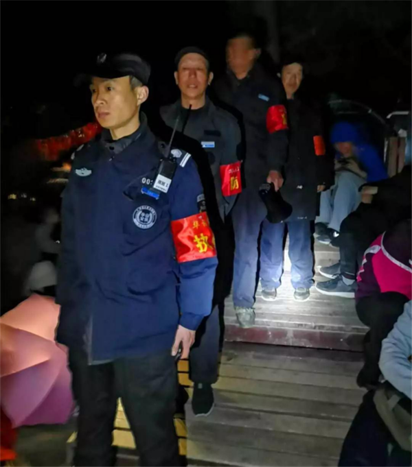 不論白天和黑夜,景區(qū)工作人員都依舊堅守崗位。他們?yōu)榕抨犛慰退腿崴?、幫扶老幼傷員、尋找并安撫失散游客、維護游覽秩序,確保游人安全舒心的游覽華山。