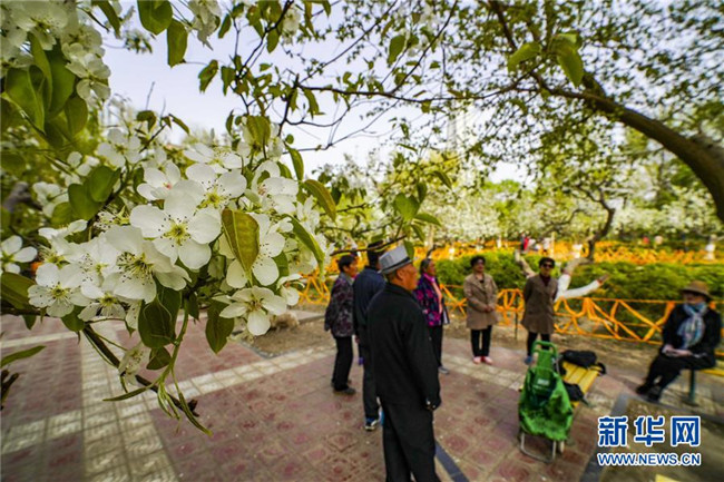 4月9日,市民在庫(kù)爾勒市梨香園中散步。 新華社記者趙戈攝