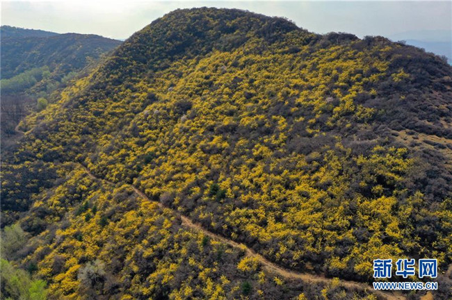 連翹花盛開在平定縣冠山上(4月10日無(wú)人機(jī)拍攝)。