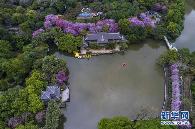 4月14日,在廣西柳州市柳侯公園,盛開的洋紫荊把公園裝扮得格外美麗(無人機(jī)拍攝)。
