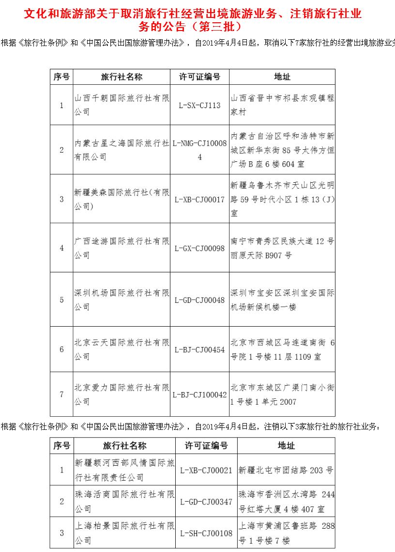 文化和旅游部近日發(fā)布公告,取消7家旅行社的經(jīng)營出境旅游業(yè)務(wù),注銷3家旅行社的旅行社業(yè)務(wù)。記者注意到,截至目前,今年文化和旅游部共取消30家旅行社的出境游業(yè)務(wù)、注銷11家旅行社的旅行社業(yè)務(wù)。戳圖看詳細黑名單。