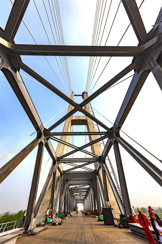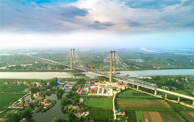 商合杭鐵路重點控制性工程裕溪河特大橋,主橋全長686米,主塔采用“H”型索塔,塔高123米。在我國時速350公里高速鐵路大跨度斜拉橋建設(shè)中,首次使用鋼箱桁梁結(jié)構(gòu)形式,首次在300米以上跨度橋梁中采用無砟軌道結(jié)構(gòu)形式,大橋主跨跨度達(dá)324米,建成后將成為目前世界最大跨度的無砟軌道高速鐵路橋梁。