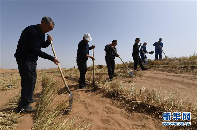 在甘肅省古浪縣境內(nèi)的黑崗沙風(fēng)沙口,八步沙第二代治沙人用稻草壓沙(2019年3月26日攝)。新華社記者 范培珅 攝