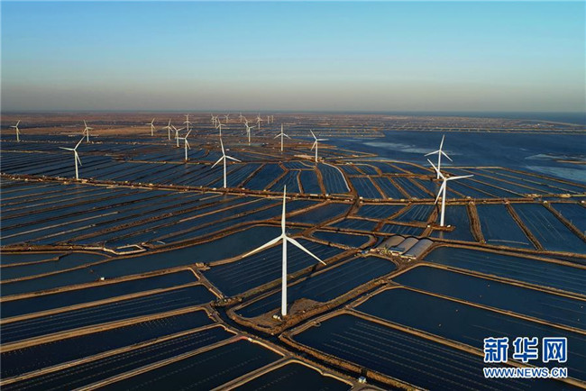 這是河北省唐山市樂亭縣姜各莊鎮(zhèn)海邊養(yǎng)殖區(qū)內(nèi)的風(fēng)電場(2018年11月10日無人機(jī)拍攝)。新華社記者 楊世堯 攝