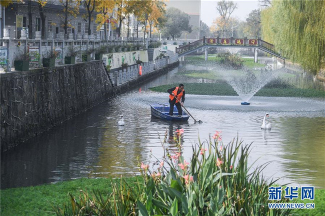 浙江省長興縣虹星橋鎮(zhèn)港口村東港內(nèi),河長孫根法在打撈水面漂浮物(2018年11月28日攝)。 新華社記者 徐昱 攝