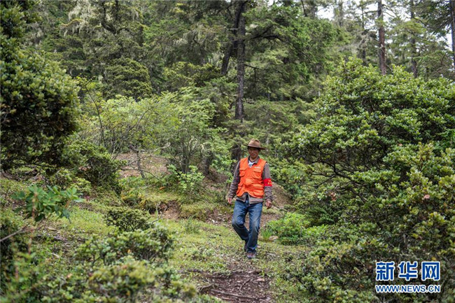 護(hù)林員孫諾在普達(dá)措國家公園里巡山護(hù)林(2018年7月18日攝)。新華社記者 胡超 攝