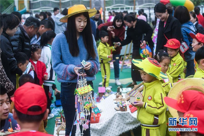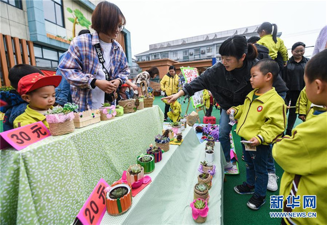 當(dāng)日,浙江省長(zhǎng)興縣畫溪街道包橋中心幼兒園舉辦校園義賣節(jié)。10多個(gè)攤位上擺放著家長(zhǎng)和孩子一起用廢舊的玻璃瓶、雪糕棍、紙盒、紐扣等廢舊材料制作而成的小木屋、迷你小盆栽、紐扣花束、風(fēng)車等手工作品,孩子們以班級(jí)為單位進(jìn)行手工作品義賣,所得款項(xiàng)將全部用于社區(qū)公益環(huán)?;顒?dòng)。主辦方介紹,希望通過這樣的活動(dòng),倡導(dǎo)廢物利用和綠色低碳的生活理念。