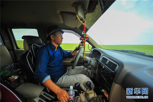 2017年7月17日,內(nèi)蒙古自治區(qū)新巴爾虎右旗克爾倫蘇木芒來嘎查黨支部書記米吉格駕車行駛在牧場(chǎng)上。新華社記者 連振 攝
