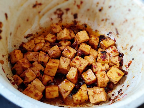 4.再把豆腐放進(jìn)去炒勻。