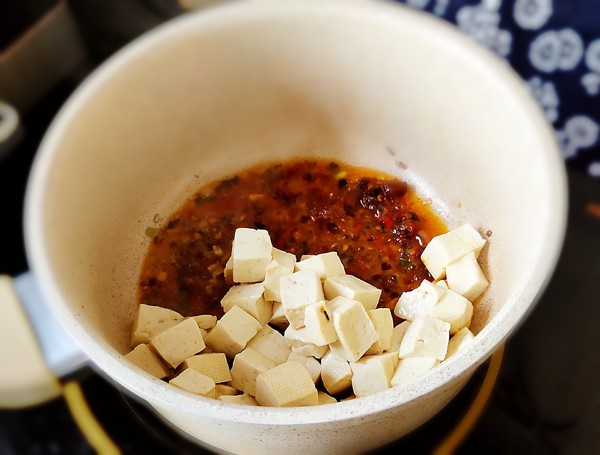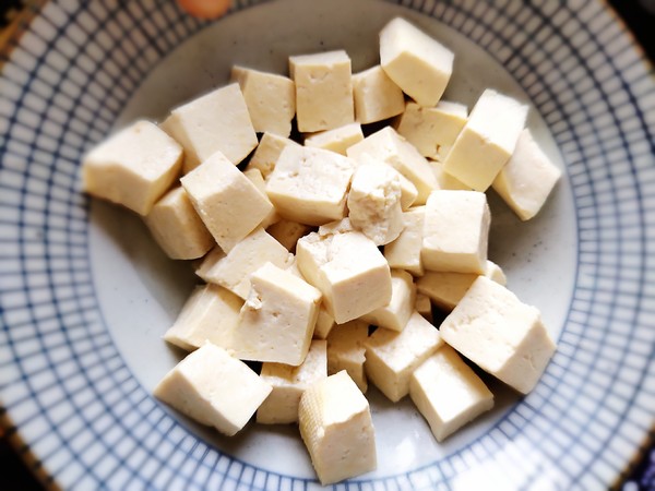 1.豆腐切成小塊兒,焯水后撈出控水備用。
