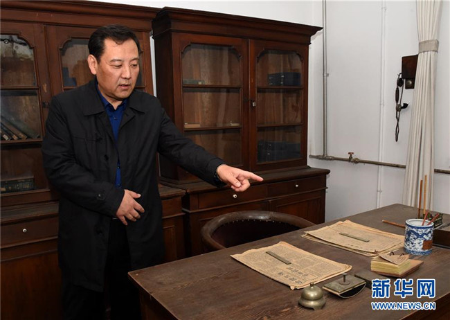 北京新文化運(yùn)動紀(jì)念館副館長李金光在北大紅樓中介紹當(dāng)年圖書館主任李大釗的辦公室(4月9日攝)。新華社發(fā)(任超 攝)