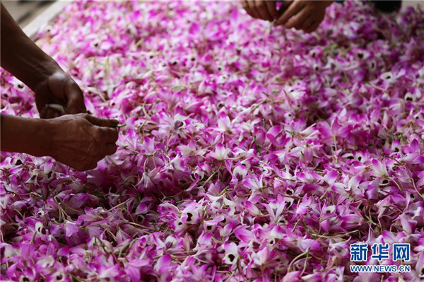 5月4日,在貴州省赤水市白云鄉(xiāng)田渡村,農(nóng)民在分揀剛采摘的金釵石斛鮮花。