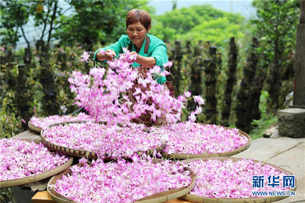 5月4日,在貴州省赤水市白云鄉(xiāng)平灘村,農(nóng)戶在晾曬剛采摘的金釵石斛鮮花。