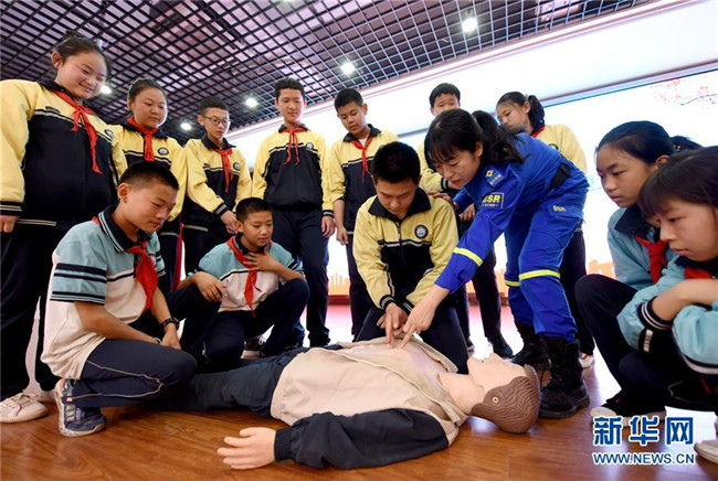 5月12日,邢臺(tái)市第八中學(xué)學(xué)生在藍(lán)天救援隊(duì)隊(duì)員的指導(dǎo)下學(xué)習(xí)心肺復(fù)蘇急救技能。 新華社記者 朱旭東 攝