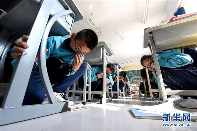 5月12日,邢臺(tái)市第八中學(xué)學(xué)生在進(jìn)行模擬防震減災(zāi)演練。新華社記者 朱旭東 攝